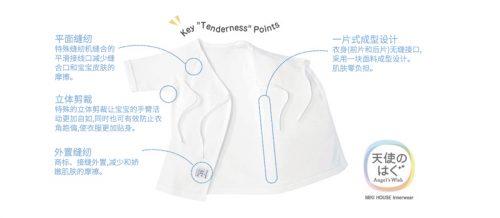 MIKI HOUSE婴儿内衣的所有缝合针脚与标签都在外侧,腋下没有缝制针脚,一片成型制作,这样可以温柔地保护宝宝娇嫩的皮肤。