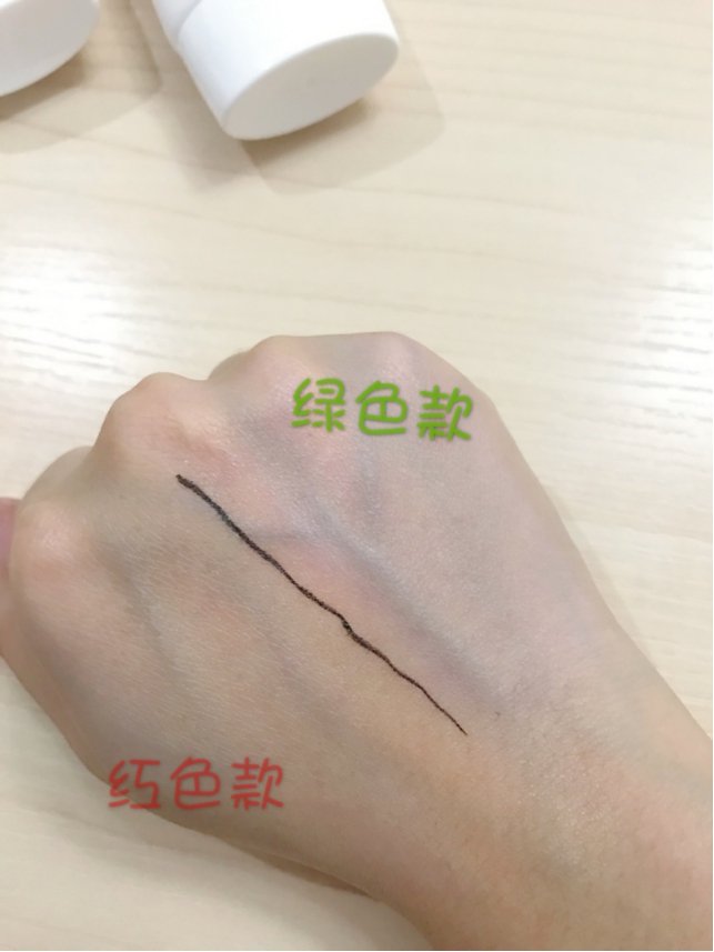 我直接在手背上测试一下两款防晒的润色效果,在手背左边涂上红色款的滋润防晒,右边涂上绿色的敏感肌防晒。