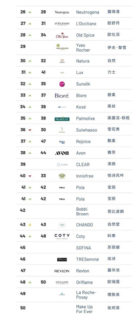 “2020全球最有价值的50个化妆品和个人护理品牌”(COSMETIC 50 2020)排行榜