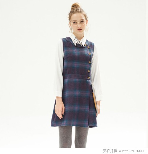 04 高腰,铜扣,格子。中规中矩的剪裁也需要开叉设计来打破常规,更何况格子是多么常见的元素,如果没有点特别的地方又怎么能足够有吸引力呢?所以纽扣放错了位置也是一种巧妙心思。