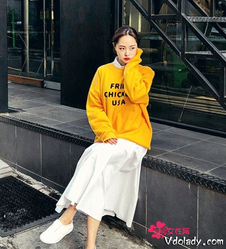 印花卫衣怎么搭配 印花卫衣相比纯色卫衣来说要活泼有趣许多,各种各样的卡通图案,字母logo,让卫衣一下子变得不那么单调。 黄色卫衣搭配白色长裙,可以将黄色的活力稍微变得柔和一些,没那么“刺眼”。而且两者都是比较清新的颜色,白色的长裙也能让整身造型更加优雅和气质。