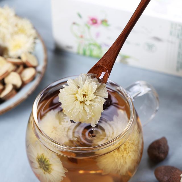 菊花,金银花,茉莉花一起泡着喝,可清热解毒,可防治风热感冒、咽喉肿痛、痈疮等,常喝更可降火,有宁神静思的效用。平常泡一杯菊花茶来喝,能使眼睛疲劳的症状消退,如果每天喝三到四杯的菊花茶,对恢复视力也有帮助,经常玩微信的朋友一定试试。日常生活中多喝菊花茶有助于防止辐射,经常对着电脑的上班族,应该多喝菊花茶,这样能够抵触电脑的辐射。