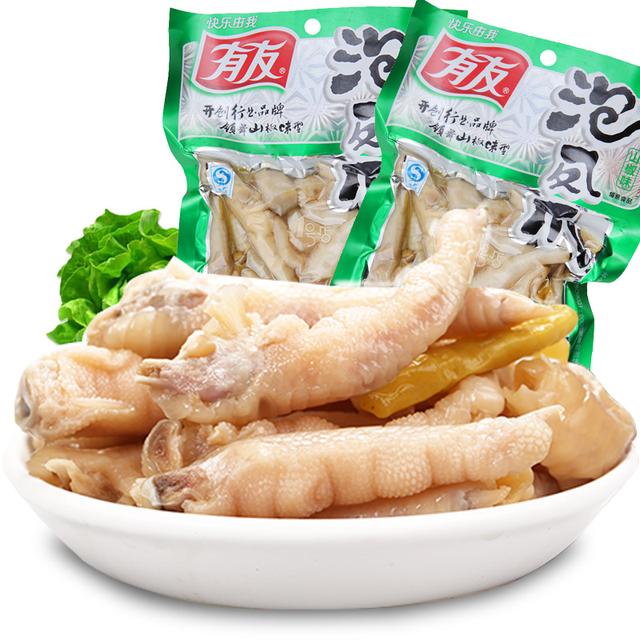 四川泡菜最重要的材料就是泡菜水,制作泡菜水的材料为:泡菜盐、花椒、水,还可以加入嫩姜,青蒜,大蒜,蒜苔提味。有友系列的泡山椒凤爪,山椒入味,鲜香诱人,鸡爪肉质肥美,充满嚼劲!吃过很多牌子的凤爪,还是觉得有友的更合我味儿!