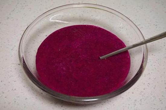 5、融化的吉利丁片液体,1/3倒入火龙果泥中,2/3倒入牛奶中,搅拌均匀。