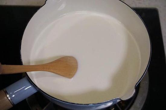 3、牛奶倒入锅中,加入白糖,加热到糖融化就关火。