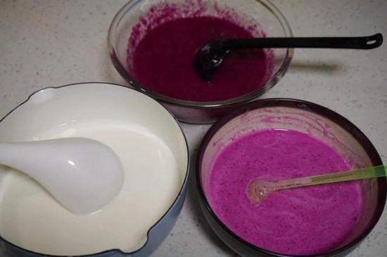 6、从牛奶和火龙果泥中各分出1/3,混合在一起,这样三种液体就都准备好了。