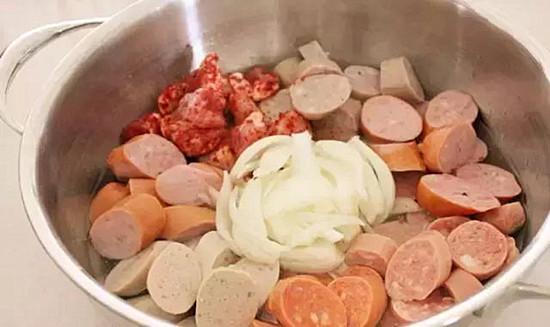 第一步: 将洋葱放入锅底,再放入火腿肠和切成块状的猪肉,再撒入一些辣椒,葱和辣椒粉。