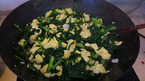 3、另起锅下油,爆炒大蒜至扁香,这是加入韭菜快速翻炒几个来回,撒入食盐,再加入鸡蛋翻炒均匀就可以出锅啦。