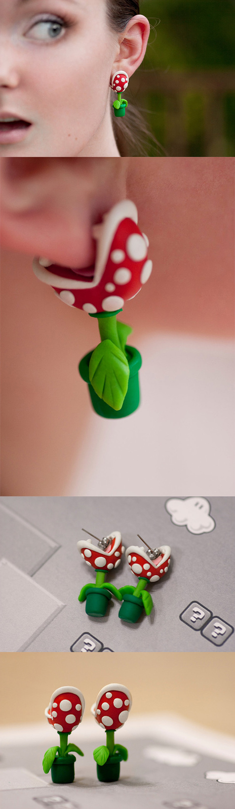 超级马里奥给我们童年带来了快乐,马里奥是靠吃蘑菇成长,闻名世界的超级巨星,不过在吃蘑菇的途中不免会遇到食人鱼植物。就这样一个游戏中出现的小小角色被设计师抓住创作除了我们这里看到的mini耳坠,食人鱼植物死死的 咬在而且上,不仅趣味,看上去还很时尚。