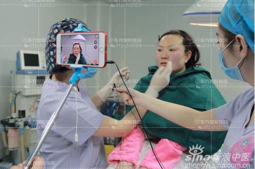 做完一侧脸后,肖肖坐起,两侧面部对比明显。之后进行另一侧面部线雕提升。