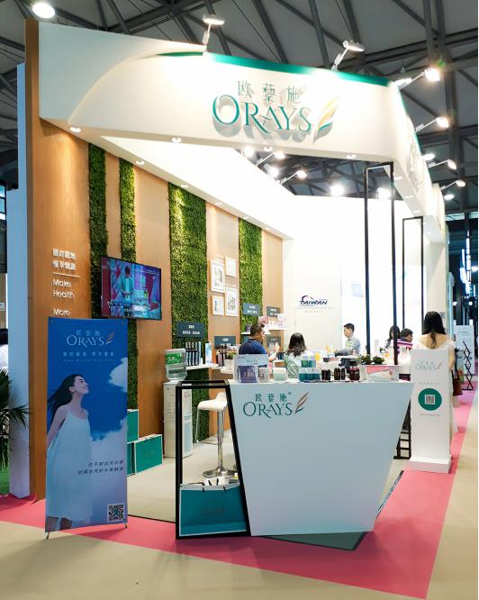 群星闪耀的美博会场,欧藜施品牌成为其中最耀眼的一颗明星,大器挑高三米半的展位,以「天然、质感」为主的装潢设计:交错木纹与绿草背墙,镶上欧藜施最得意的几项主力产品:致女神酵素、靓肌胶原蛋白、富酵素、红蕴酵素。