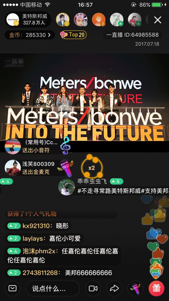 除了五大代言人的惊喜现身,Metersbonwe还邀请了各大时尚达人、意见领袖进行了多平台直播,与线上粉丝共同见证Metersbonwe的全新裂变,感受发布会现场的热烈气氛。直播一上线,就已登上了各大直播平台的热榜,粉丝刷弹幕刷留言与主播对发布会现场进行了多形式互动,与全国亿万青年实时共享了五大风格的全新裂变。五大代言人与直播平台粉丝进行了快问快答的互动环节,趣味十足,让直播的高潮不断,在几个小时的直播里,各个平台的直播观看人数总和超过3500万。