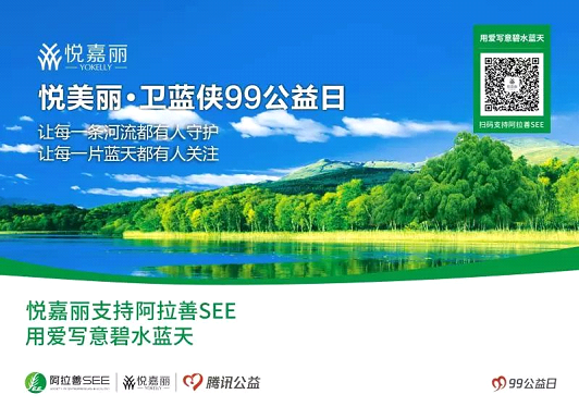 悦嘉丽深知这样远远不够,绿色公益的发展和壮大需要更多人的参与。因此悦嘉丽在今年的99公益日上携手阿拉善SEE、腾讯公益发起 “卫蓝侠守护碧水蓝天”公益项目,号召全民一起共同守护碧水蓝天。这个公益项目得到了超过11万人次的支持,共募得善款473.55万元,继续推进水、空气等环境污染问题的治理。