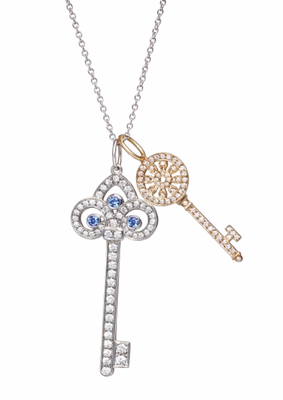 这次独家呈献的四款独特Tiffany Keys吊坠﹕铂金镶蓝宝石及钻石鸢尾花钥匙吊坠、铂金镶樱花粉宝石及钻石鸢尾花钥匙吊坠、铂金镶钻花瓣钥匙吊坠以及18K玫瑰金镶钻花瓣钥匙吊坠。这四款全新Tiffany Keys吊坠光彩照人,是乐观与希望的象征并流露着这系列设计的沿革。吊坠推出于佳节时分,是优雅永恒的赠礼之选,可代代相传且令人珍而重之。