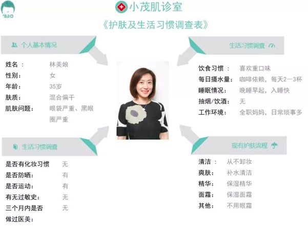 林美娘,35岁,适逢今年小孩上初中,操心之余经常整晚睡不踏实,皮肤状态急剧下降,特别是一双眼睛,简直写满疲惫。林美娘有非常好的运动习惯,是瑜伽达人,但清洁习惯很差。经常素面朝天不保养,长期以往容易加速皮肤失水,造成皮肤粗糙,加速衰老。