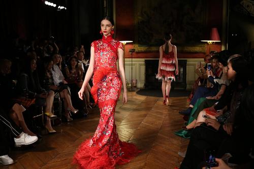 需要提醒你注意的是,这已不是渔Fishing首次出征国际时装周。去年10月,渔Fishing就曾以十五套匠心巨制的高定礼服在巴黎雅克马尔-安德烈博物馆华美展颜,从绣、印、作、融四个方面呈现一场别开生面的视觉盛宴。渔Fishing通过巧妙撷取蝴蝶、葫芦、狮子、麒麟、喜字图等五千年文化符号,诠释了东西方服装艺术交织碰撞的无限可能。