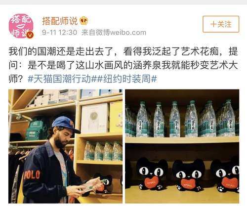 涵养泉不但在纽约时装周备受欢迎,更在国外社交网络Instagram、Facebook上猛烈圈粉,引发极高的讨论度。许多时尚潮人把在“国潮馆”拍摄的涵养泉照片和拿着涵养泉单品拍出的时尚街拍照Po到了Facebook和Instagram,配文中更是对这款“水中国潮”表示钟爱有加。