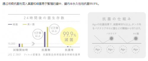 抗菌,它是认真的。通过将银系抗菌剂加入在霉菌和真菌易于繁殖的容器中, 能够半永久性地使水箱抗菌至99.9%。另外还有单独销售的次氯酸水“ECLEAR 0”,也能够使水箱保持清洁状态,可以给加湿器除菌、消臭。