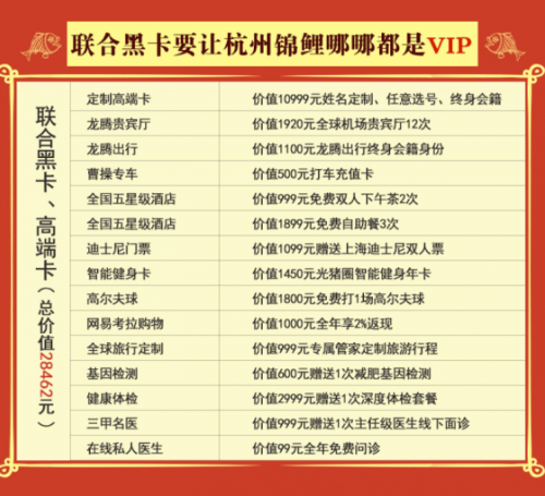 联合黑卡受邀成为锦鲤活动的赞助方之一,为锦鲤提供了总价值近3万元的高端黑卡服务和多项惊喜大奖。获奖锦鲤不仅可以把这张姓名定制、任意选号、终身会籍的定制高端黑卡带回家,更能同时坐拥龙腾出行终身会籍身份、机场高铁贵宾厅、曹操专车充值卡、全国五星级酒店免费餐饮、全球旅行定制、高尔夫球体验、上海迪士尼双人门票、基因检测、智能健身年卡、三甲医院健康体检和名医面诊、在线私人医生全年免费问诊和网易考拉购物返现等多项惊喜特权,让杭州锦鲤哪哪都是vip!