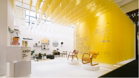 2019年尖叫设计展位沿用北欧环保生活的概念,大胆的使用了可循环再利用的轻质半透明挂布代替传统墙面隔断围合成不同的家庭场景,既分隔了空间,又使不同的场景之间,形成一种空间的对话。在整体设计上,特意用挂布压低视线,使观众更加聚焦设计作品。