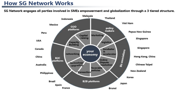中小企业全球价值链联盟(SG Network)最早由王树彤在亚特兰大2019年ABAC第一次会议上提出,旨在链接亚太区域各经济体的中小企业以及服务商,为来自不同国家的中小企业搭建资源互通、贸易互动的平台,真正调动全球资源来赋能中小企业。本次雅加达会议上,王树彤进一步展示了中小企业全球价值链联盟(下简称联盟)的全景架构。