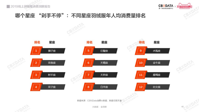 最后,CBNData《报告》还奉上三份趣味榜单,让你了解哪座城市的人买下了最贵的羽绒服;哪座城市的男生最怕冷以及什么星座最爱在羽绒服上“剁手”。